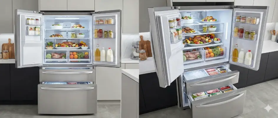 طراحی بدنه (Design): مدلهای ۴ درب (فرنچ دور) مثل X39 و X24 که گرانترینهای لیست هستند، فضای عظیم ۳۴ فوت و چیدمان یخچالِ عریض دارند. در مقابل، ساید بای سایدهای کلاسیک قیمت مناسبتری دارند.
