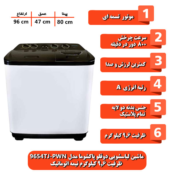 ماشین لباسشویی دوقلو پاکشوما مدل PWN-9654TJ ظرفیت 9.6 کیلوگرم نیمه اتوماتیک