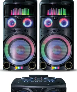 اسپیکرهای سری KM میکرولب با آمپلیفایر جدا، مخصوص حرفهایها و علاقهمندان به صدای بسیار قدرتمند طراحی شدهاند. مدلهای KM-S200 و KM-V200 با توان واقعی ۳۰۰ وات و چهار ووفر ۱۲ اینچی، قادر به تولید صدایی با حجم و بیس فوقالعاده بالا هستند که برای برگزاری جشنهای بزرگ ایدهآل است. تفاوت اصلی این دو مدل در نوع رقص نور سه بعدی آنهاست؛ مدل V200 دارای رقص نور طرح UFO و مدل S200 دارای رقص نور طرح باران (RainFall) است که هر دو جلوهای بینظیر و حرفهای به محیط میبخشند. آمپلیفایر جداگانه به شما کنترل کامل بر روی تنظیمات صدا شامل بیس، تریبل و اکولایزر را میدهد و با دو میکروفون بیسیم همراه، همه چیز برای یک اجرای حرفهای آماده است.